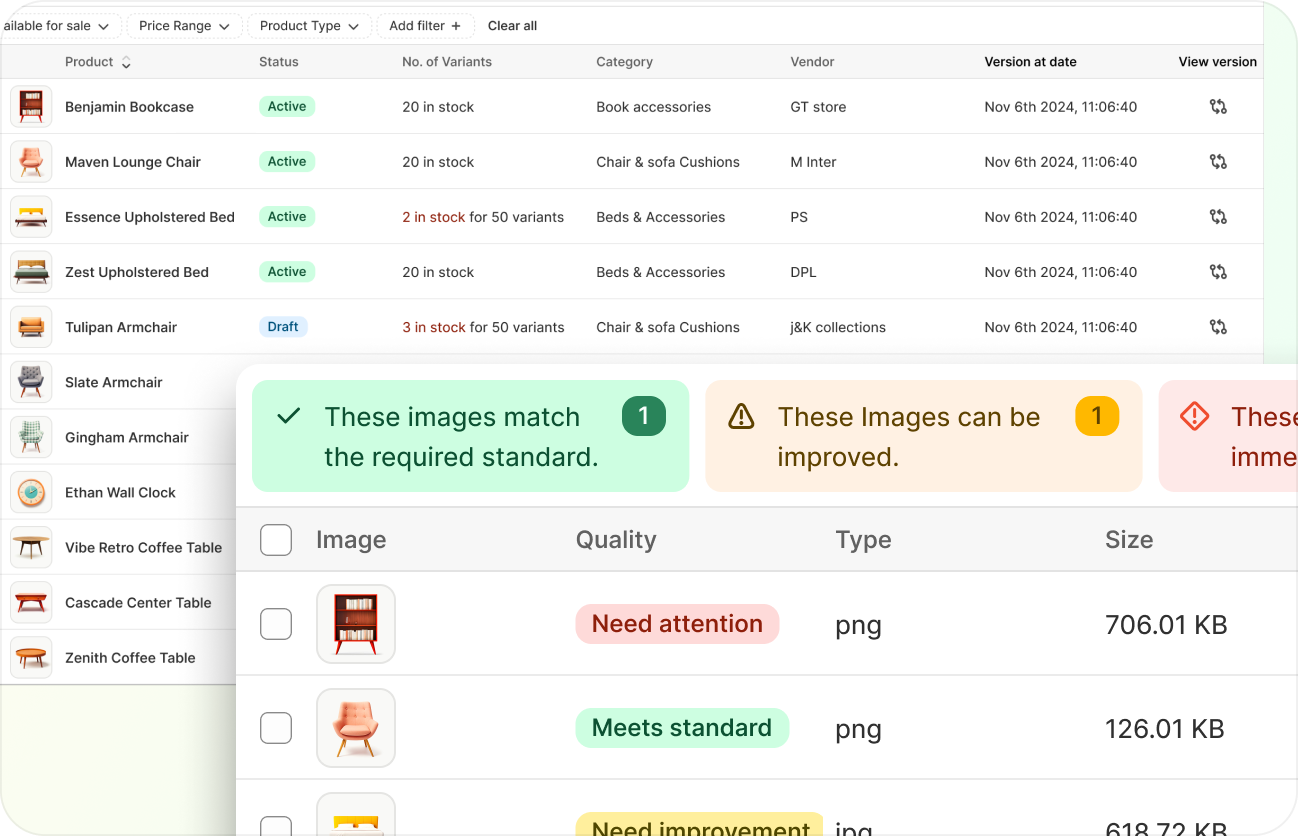MerchPIM highlights products that lack lifestyle shots, images without alt text, and duplicated or miscategorized assets. Because a polished storefront isn't just aesthetically pleasing, it's also a strategic move.